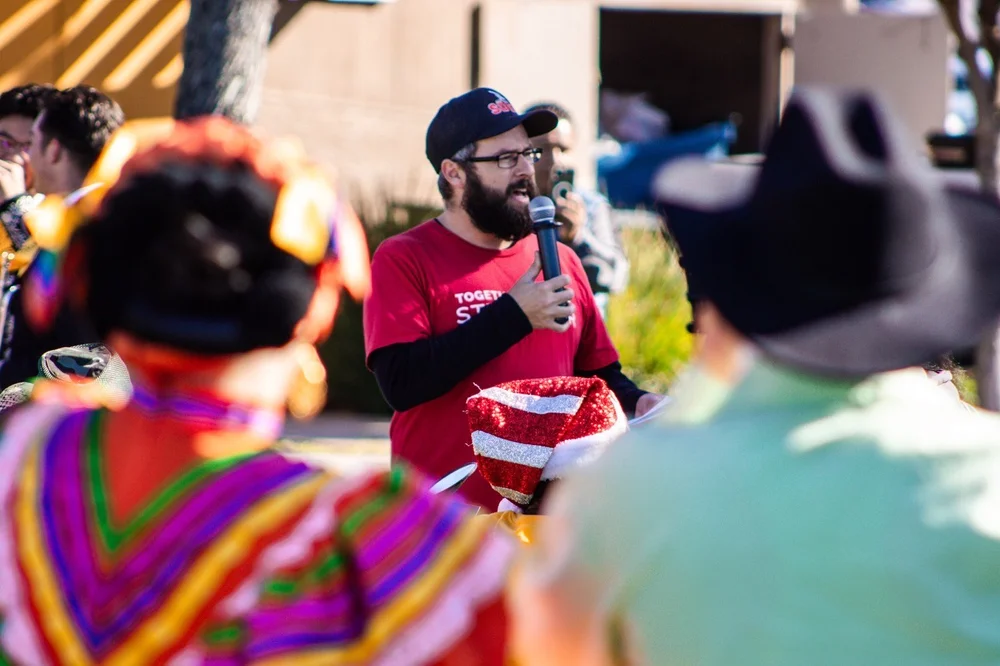 Armed with yellow safety vests, flags, bullhorns, and inflatable costumes, community members from all over the county rallied around an impromptu stage and pop-up tents to hear speeches from community organizers working in a plethora of activist spaces from tenant organizing and labor unions to migrant rights and anti-surveillance work. Mariachi Cali scored the rally, performing familiar cultural anthems and providing customized intro and outro music for each speaker, transforming a manicured park into a vibrant community space.
