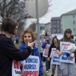 Members of other unions representing thousands of non-nursing staff workers across UMass — the United Food and Commercial Workers (UFCW) whose members had a contract fight of their own with the University hospital just last summer, the State Healthcare and Research Employees Union (an affiliate of AFSCME), and the United Auto Workers — joined the picket. So too did MNA nurses working at Saint Vincent’s.