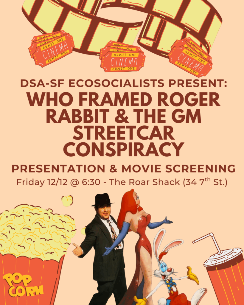 Who killed the electric streetcar? Come watch a cartoon classic with DSA SF’s Ecosocialist working group and friends around the Bay Area on Friday, December 12 at 6:30 at the Roar Shack (34 7th St). We’ll be watching Who Framed Roger Rabbit?, highlighting the often forgotten sub plot, and exposing the dark history behind it. Together, we’ll learn about the real transit history behind where Disneyland’s famous streetcar comes from.