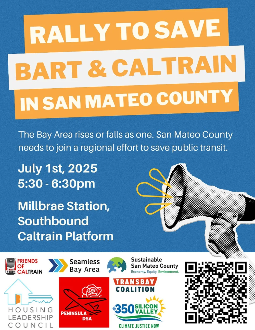 Transit coalition poster for July 1st Rally to Save BART & Caltrain in San Mateo County.